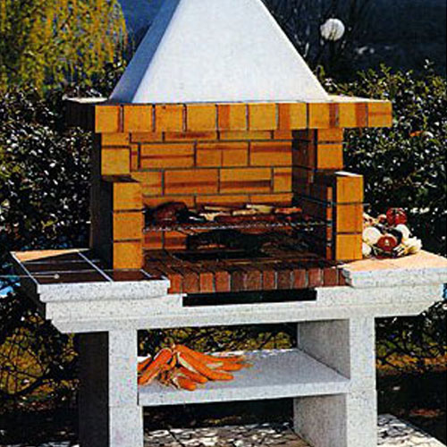 Барбекю из белого шлифованного конгломерата, плита из греса. Топка и консоль из огнеупорного кирпича, зольник с решеткой, решетка для жарки с направляющими. Короб и колпак из конгломерата белого цвета. Размер топки 70х55.