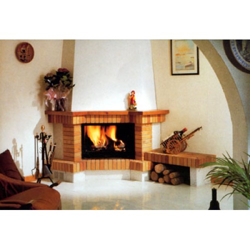 Угловой камин из огнеупорного кирпича толщиной 5 см. Основание и боковые детали изготовлены из прессованного камня белого цвета. Металлическая топка 904 с колосником и зольником.