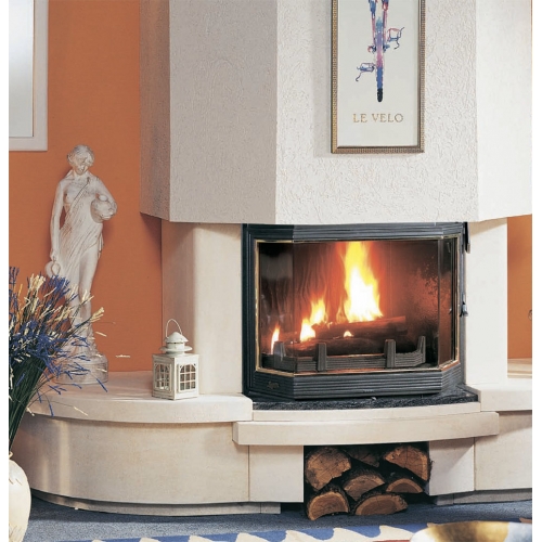 Камин из камня Blanche с чугунной топкой. Топка с керамическим стеклом призматичной формы. Внизу предусмотрено место для дров.