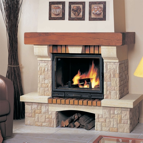 Дровяной фронтальный камин, выполненный в стиле кантри. Портал облицован песчаником Gard. Декоративная балка из массива дуба. Топка с прямой стеклянной дверцей. Под топкой отведено место для дров.