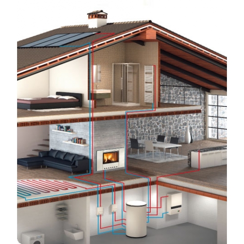 Термо топка MT  с бойлером может быть подключена к конвекционному или лучистому отоплению,  или же сопряжена с солнечным отоплением.