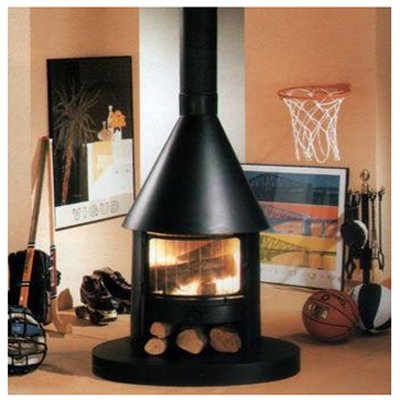 Круглый центральный металлический камин с дверцей и нишей для дров. Зольник с решеткой встроены в нижнюю часть камина. Металлическая труба, общая высота камина 2,6 м, дымоход диаметром 150 мм.