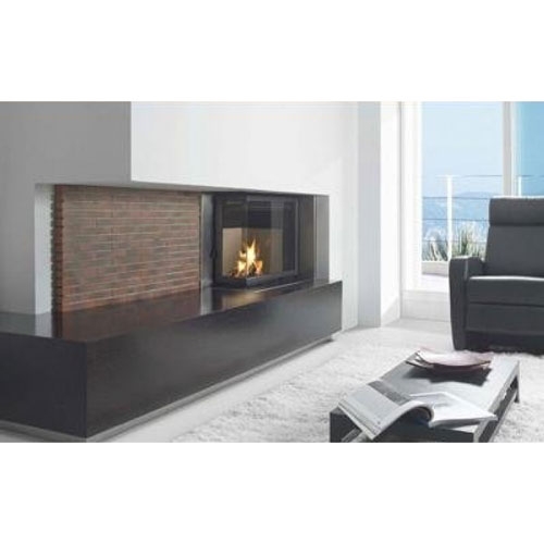 Камин, плита и цокольная часть отделаны шпоном Wengue. Цоколь и рамка топки из нержавеющей матовой стали. Фасад из красного, обожженного кирпича, толщиной 3 см. Топка "гильотина" с панорамным стеклом Double Quart.