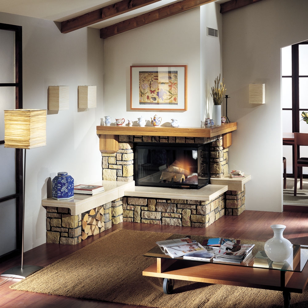 Угловой камин в стиле кантри под закрытую топку, высота цоколя - 38 см. Изготовлен из мрамора Vicentini грубой обработки с плитой из полированного мрамора Trani и дубовой балкой.