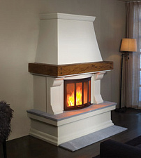 Finse - каминная модель, работающая на топливной древесине с влажностью не более 20%. Дизайн камина относится к стилю кантри (деревенскому): Д-образная форма корпуса, деревянная каминная балка и высокий дымоходный колпак.