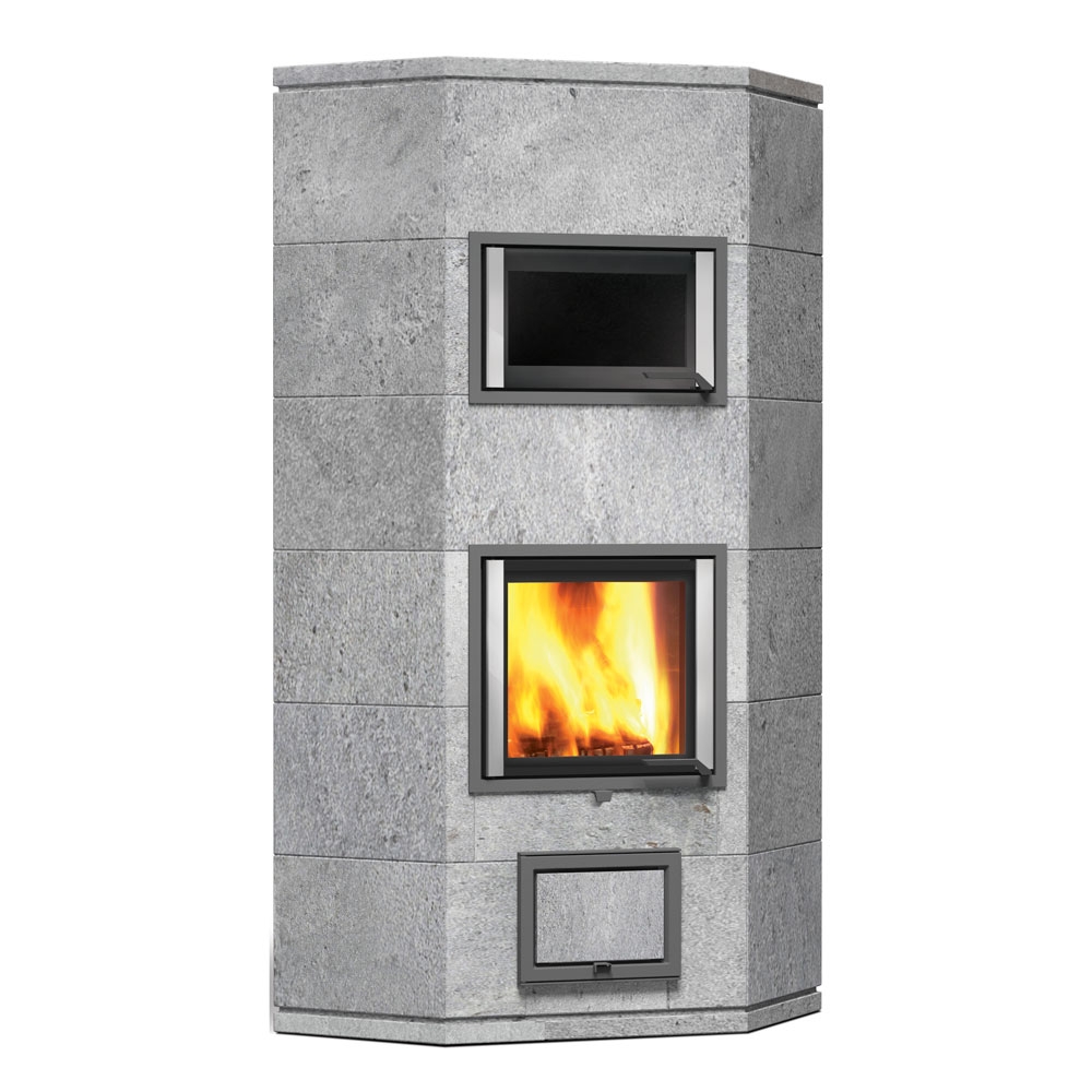 Угловой печь-камин с верхним подключением 2 теплового класса, для больших помещений.