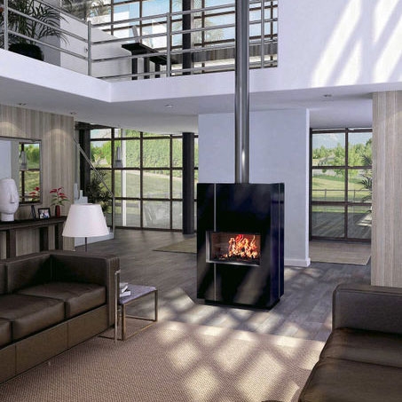 Металлическая отопительная печь-камин. Ввод наружнего/первичного воздуха. Облицовка для топки из нержавеющей стали. Вертикальная полоска-инкрустация из нержавеющей стали. Поднимающаяся и открывающаяся классическим способом дверца. Цвет RAL 9005.
