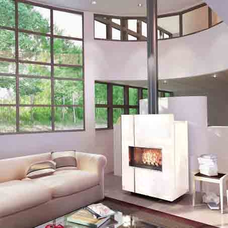 Металлическая отопительная печь-камин. Ввод наружнего/первичного воздуха. Облицовка для топки из нержавеющей стали. Вертикальная полоска-инкрустация из нержавеющей стали. Поднимающаяся и открывающаяся классическим способом дверца. Цвет RAL 1013.