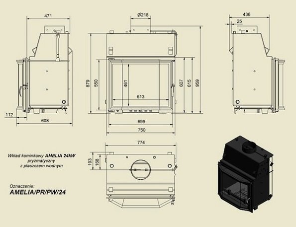 Топка с водяным контуром AMELIA/PR/PW/24, призматическое стекло