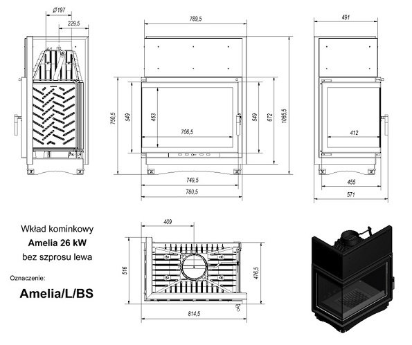 Топка AMELIA/L/BS, Г-образное стекло слева