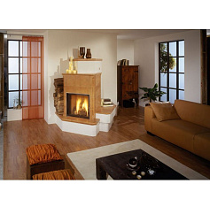 Угловая каминная топка с Г-образным стеклом. Боковое стекло слева. Топочная камера футерована шамотом. Подъёмный механизм двери (система Easy-Lift). Возможно подключение воздуха извне.