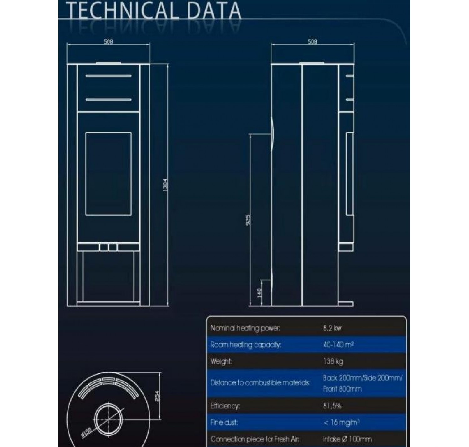 - Диаметр дымохода, (мм) 150 мм.