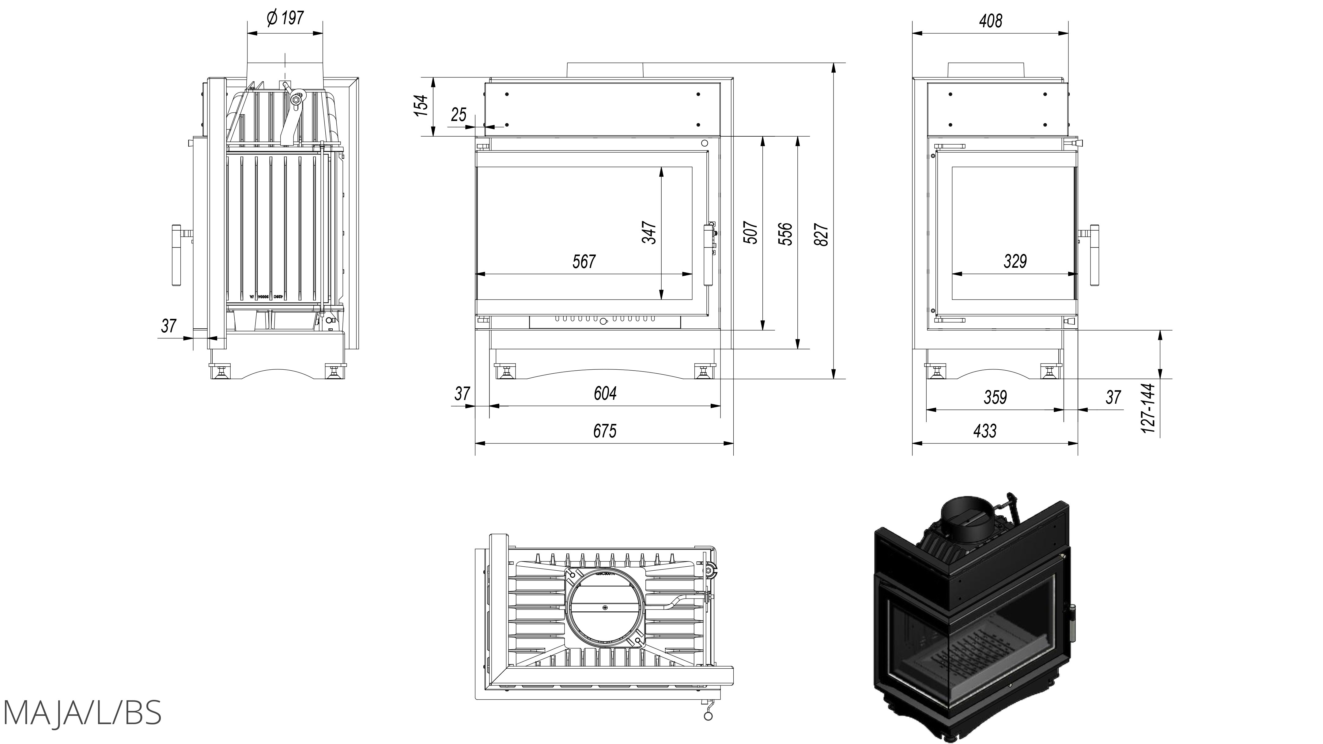 Топка для камина непрерывного сгорания серии Kratki Maja/L/BS (Г-образное стекло слева) – чугунная топка, предназначенная для работы на твердом топливе, в качестве которого используются сухие дрова (также возможно использование бурого угля в брикетах).