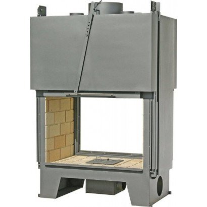 Классическая закрытая двухсторонняя каминная топка с двумя открывающимися дверцами. Топка футерована шамотным кирпичом. Эта разделяющая топка предназначена для установки непосредственно в стене.